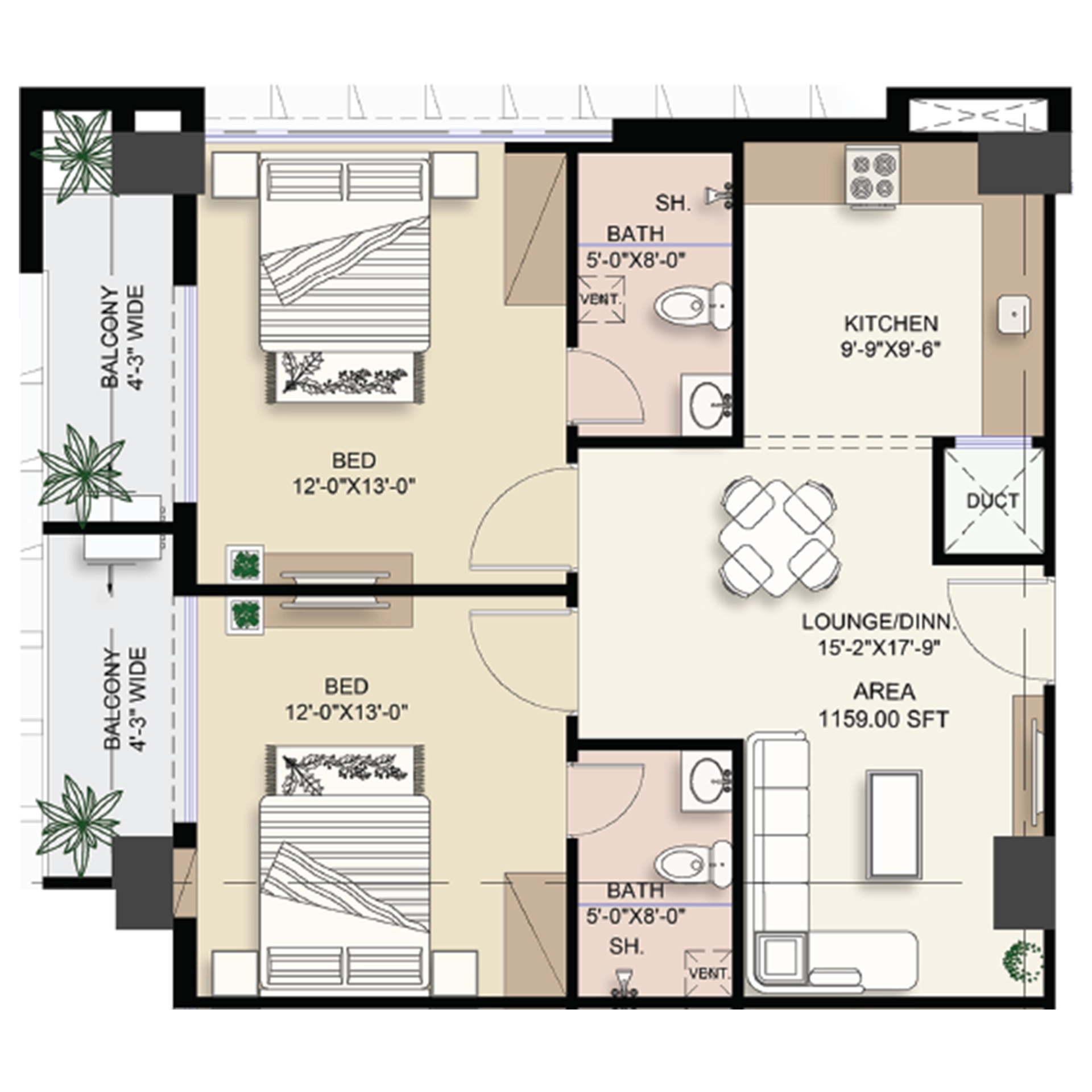 Total Area 1159 Sq.ft · 15% Down Payment